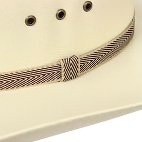 Chapéu Country da marca Mundial modelo Americano Barretos, fabricado em Palha (Lona) na cor Natural, possui carneira de elástico que auxilia na fixação na hora do encaixe e bandinha em tecido trabalhado resistente.