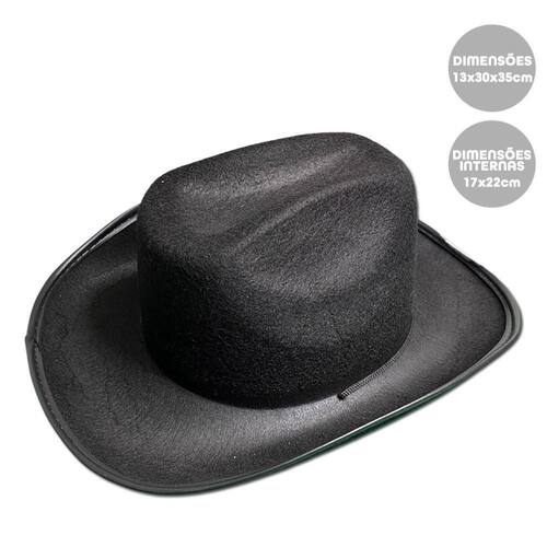 Chapéu Cowboy Country Junino Preto Em Feltro Tamanho Único Medidas externas: 13 altura x 30 largura x 35 comprimento cm Medidas internas parte da cabeça : 17x22cm Composição: Feltro O chapéu perfeito para você incrementar sua fantasia e deixar tudo ainda mais divertido