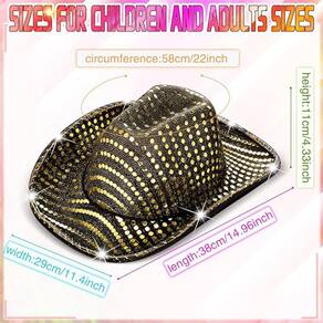 Material: jeans Tamanho: 38* 29* 11 cm; circunferência do boné 58 Peso: 102 g Design de lantejoulas douradas brilhantes: este chapéu de cowboy preto apresenta lantejoulas douradas deslumbrantes, criando um efeito visual impressionante que é perfeito para roupas que chamam a atenção. Característica de iluminação LED: equipado com luzes LED ao longo da aba, este chapéu adiciona um toque brilhante e festivo ao seu look de Halloween ou cosplay. Construção durável: feito de material EVA de alta qualidade, este chapéu de cowboy é resistente, leve e projetado para durar em vários eventos e festas. Perfeito para festas temáticas: se você estiver participando de um evento com tema ocidental, festa de Halloween ou convenção de cosplay, este chapéu é o acessório definitivo para completar sua roupa. Tamanho único para a maioria: este versátil chapéu de cowboy se encaixa confortavelmente na maioria dos adultos, oferecendo um ajuste ajustável para um uso seguro e confortável durante a noite.