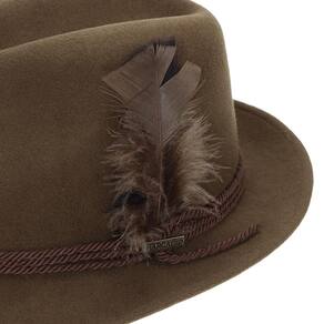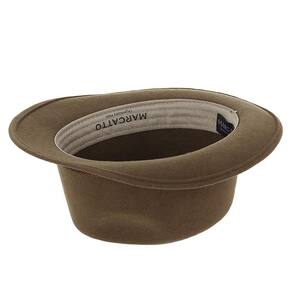 Chapéu Social Marcatto fabricado em Feltro extra macio cor Pino, copa de 10cm a aba de 4,5cm, carneira em tecido e bandinha em corda de nylon torcida com detalhe de penas e boton de metal da marca.