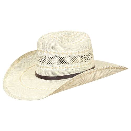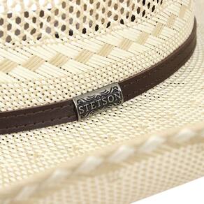 Chapéu Country modelo 20X da marca Stetson, fabricado em palha estilo shantung com aba de 11cm e copa de 12,5cm, carneira de material sintético que proporciona melhor firmeza e ajuste, a banda que envolve a copa é fabricada em couro costurado na cor marrom dando um toque discreto ao modelo.