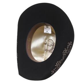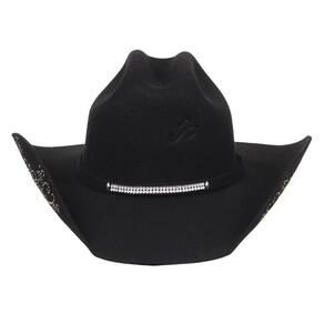 O Chapéu modelo Arizona da Pralana é feito de um feltro em lã de alta qualidade, o que o torna durável e resistente às intempéries. Com uma cor preto, ele apresenta uma aba larga de 9,5cm e topo quadrado de 11cm, característicos dos chapéus. A parte interna possui uma faixa de recouro, que ajuda a manter a cabeça no lugar. O chapéu também é decorado com uma bandinha de feltro customizada com strass, as abas também são personalizadas com strass, o que adiciona um toque elegante e sofisticado ao design rústico. Com sua combinação de estilo e funcionalidade, este chapéu é a escolha perfeita para cowboys e cowgirls que buscam uma peça clássica e atemporal para complementar seu visual country.