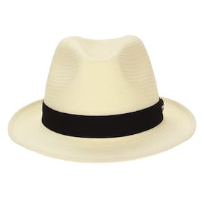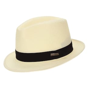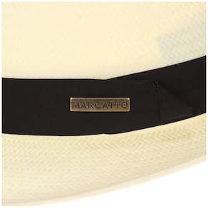 Chapéu Marcatto, fabricado com fibras de celulose estilo palha cor Marfim, aba de 5cm, copa de 10cm, banda em tecido trabalhado com detalhe em boton de metal personalizado da marca e carneira de espuma com acabamento em tecido. Fino acabamento.