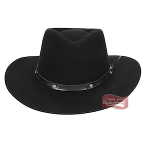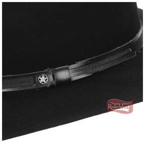 Chapéu Pralana 5X modelo Campo IV fabricado em Feltro 100% Lã cor Preto, aba de 7cm e copa de 10,5cm, carneira de elástico, banda de recouro com acabamento em margaridas de metal e fita de nylon. Fino acabamento.