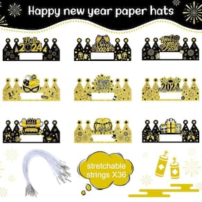- O pacote inclui: você receberá 36 peças de chapéus de festa de Feliz Ano Novo que vêm com 9 estilos diferentes nas cores preto e dourado e 36 peças de cordas ajustáveis; esta decoração de chapéu de papel de festa de Ano Novo parece bonita e atraente com cores vivas, e esta coroa de Ano Novo animará seus convidados e adicionará uma forte atmosfera calorosa às festas