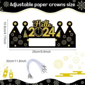 - Design elegante de Ano Novo de 2024: esses chapéus de Ano Novo são desenhados em cores vibrantes em preto e dourado e em forma de coroa com espaço em branco para você anotar o nome ou os planos de Ano Novo; todas as coroas de papel de Ano Novo são feitas de diferentes elementos de Ano Novo, incluindo letreiros de Feliz Ano Novo 2024, fogos de artifício, bolos, caixas de presente, balões e muito mais, adicionando uma atmosfera acolhedora às festas de Ano Novo