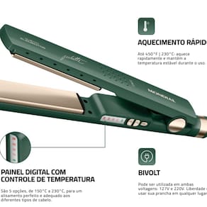 Cerâmica: distribui o calor de forma uniforme, proporcionando um alisamento rápido e sem danificar os fios.