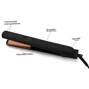 Para dar um tratamento impecável aos seus cabelos, nada melhor do que aproveitar os recursos da Chapinha Malina Elite Black Classic! Ela sela a cutícula do fio de dentro para fora graças às tecnologias de íons negativos e infravermelho, placas de titânio puro e os seus 40W de potência. Tudo isso faz com que o seu cabelo fique mais resistente à umidade.