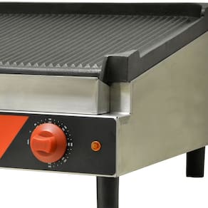 Char Broiler Elétrico 48x38cm CBE5 Croydon. Ideal para padarias, lanchonetes, bares e similares. Grelha em ferro fundido e gabinete em aço inox, com superfície de preparo inclinada para dreno de gordura e caixa coletora frontal que facilita a limpeza. ÁREA ÚTIL DE TRABALHO: 48x38cm. POTÊNCIA: 3400W. CORRENTE: 15,5A. CONSUMO: 1,7kWh. PESO BRUTO: 22,5kg. DIMENSÕES(CxAxL): 48x28x50cm. Char Broiler Elétrico 48x38cm CBE5 Croydon é na Atau.