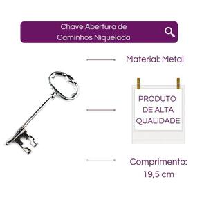 Chave Abertura de Caminhos Prateada 19,50 cm em Metal Esta Chave serve para abrir caminhos, atrair energias positivas para sua vida e também trazer mais proteção espiritual para sua vida e contra invejas. Tem o poder de transmutar energias. Descrição Conteúdo da embalagem: uma chave. Dimensões aproximadas do produto: Largura total: 5,50 cm Comprimento total: 19,50 cm Peso aproximado: 100 g Material: Metal Tire todas as suas Dúvidas antes de concluir a compra. Iremos responder o mais breve possível. Embalagem de Envio: Caixa de papelão ondulado, plástico bolha, conforme necessidade do produto. Ótima resistência e durabilidade. Respostas das dúvidas mais frequentes na ordem: R1: Já realizamos milhares de entregas em todo o Brasil, somos especialistas no que fazemos. R2: Assim que seu pedido for despachado, esta plataforma envia para você o código de rastreamento. R3: Enviamos o produto 100% inspecionado e conferido em nosso checkout e são embalados em embalagem de papelão e plástico bolha. R4: O tempo de entrega irá depender totalmente do seu CEP, todos os nossos produtos saem de Capital. R5: Iremos despachar o seu produto o mais rápido possível, assim que for confirmado pela plataforma, enviamos em até 24h. R6: Nós queremos a sua satisfação, qualquer problema iremos te auxiliar em nossos canais de comunicações
