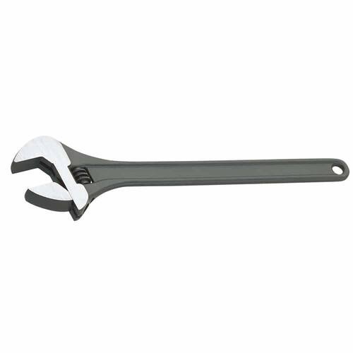 Chave Ajustável (Chave inglesa) produzida em aço-liga de alta resistência mecânica. Acabamento escurecido e cabeça lixada. Modelo sueco, com inclinação da cabeça em relação ao cabo. A espessura da extremidade da boca é robusta.