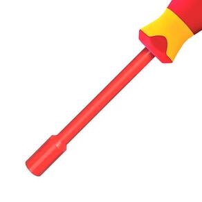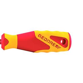 Aço especial e polímero anti-chamas, nas cores vermelho e amarelo, padrão Gedore. Haste com acabamento escurecido. Com revestimento produzido por injeção, propiciando isolação até 1000 V, conforme norma EN 60900 / IEC 60900, submetida à ensaio de: impacto, tensão elétrica, aderência, inflamabilidade e pressão. Utilizar ferramentas isoladas VDE, em tensão máxima de 1000 V em corrente alternada e 1500 V em corrente contínua, conforme norma EN 60900 / IEC 60900. Atende com segurança a norma regulamentadora NR 10 - Segurança em Instalações e Serviços em Eletricidade, possui certificado de isolação. Empunhadura ergonômica em 3 componentes Power-Grip 3, que permite ao operador a execução do trabalho preciso e sem fadiga, devido ao ajuste positivo da empunhadura e encaixe para transmissão de força adequada. Profundidade interna: 25 mm. Chave com perfil de encaixe para parafuso com sextavado externo.