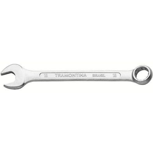 Para trabalhar com parafusos e porcas, por mais emperrados ou desgastados que estejam, a Chave Combinada 18 mm Tramontina Basic com Corpo em Aço Especial Cromado vai ser a auxiliar perfeita! Ideal para apertar e afrouxar parafusos ou porcas com perfil quadrado ou sextavado, é produzida em aço especial com acabamento cromado, o que garante resistência e durabilidade à peça. Além do mais, ela possui duas configurações: de um lado chave fixa e do outro chave estrela, o que a torna uma ferramenta super versátil. Garanta a sua e complete seu kit de ferramentas! Orientações Corpo forjado em aço especial e temperado.Acabamento cromado.Abertura das bocas calibradas.Pescoço curto.O teste de dureza é realizado em vários pontos para assegurar a resistência ao desgaste da chave durante o uso ininterrupto.As aberturas das bocas das chaves de aperto são verificadas com gabaritos calibrados, o que garante seu perfeito acoplamento nos parafusos.Alguns tipos de chaves de aperto são fornecidos em bitolas métricas e em polegadas, para o uso nos diversos fixadores disponíveis.As ferramentas são produzidas e testadas conforme normas específicas. Características Gerais EAN13 7891114066609 DUN14 17891114066606 NCM 8204.11.00 Peso Líquido 0,1600 kg. Peso Bruto 0,1600 kg. Metragem 0,000385 m³. Dimensões Embalagem (Compr. X Larg. X Alt.) 280x 55x 25 mm. Dimensões Produto (Compr. X Larg. X Alt.) 219x 40x 12 mm. Dimensão Extra A 6,6 mm. Dimensão Extra B 219,0 mm. Dimensão Extra C 12,0 mm. Dimensão Extra D 40,5 mm. Observações Use óculos, luvas e outros equipamentos de proteção de acordo com a tarefa a ser executada. Não golpeie as chaves, a não ser que sejam projetadas para este fim. Sempre utilize uma chave de bitola correta para cada parafuso ou porca para que não haja folga, pois isso danifica a chave e o parafuso. Mantenha a chave limpa para um melhor agarre, pois usá-la suja com graxa ou óleo pode causar acidentes. Não use tubos ou extensões para obter mais torque. Não altere a forma original das chaves. Armazene em local limpo e seco.