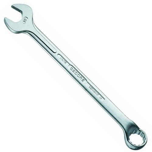 Aço Gedore-Vanadium. Acabamento niquelado e cromado. Chave combinada com um lado boca e outro Unit Drive com as mesmas medidas. A Unit Drive proporciona uma distribuição uniforme da força aplicada na parte central do sextavado, não havendo deformação dos cantos das porcas e parafusos. Inclinação em relação ao corpo: boca 15º e Unit Drive 10º. Parede fina.