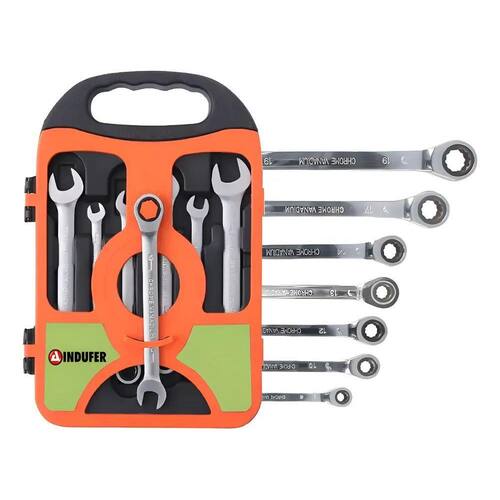 O jogo de chaves combinadas com catraca tem perfil fino para trabalhar em áreas estreitas, composto por um estojo plástico com 7 peças.