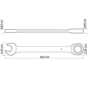 Forjada em aço cromo vanádio e temperada. Catraca com 90 dentes. Cabeça usinada. Acabamento cromado. Catraca fosfatizada. DIN 3113. Tamanho: 11 mm