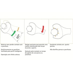 Cabeça usinada. Acabamento cromado. Catraca fosfatizada. Abertura da boca calibrada. 60 dentes. As chaves de aperto são produzidas em aço ligado com cromo vanádio (Cr-V), e após submetidas a testes rigorosos de torque para atender a norma DIN 1711-1. O teste de dureza é realizado em vários pontos para assegurar a resistência ao desgaste da chave durante o uso ininterrupto. Afrouxar e apertar parafusos e porcas sextavadas e quadradas. Sua forma construtiva permite apertar parafusos e porcas sem precisar tirar a chave para encaixá-la a cada movimento, o mesmo acontece se inverter a chave para afrouxar. Lado estrela possui mecanismo com catraca que permite realizar trabalhos com mais agilidade e facilidade do que uma chave estrela comum. Catraca com construção robusta que permite dar apertos finais conforme DIN-ISO 1711-1. As ferramentas são produzidas e testadas conforme normas específicas.