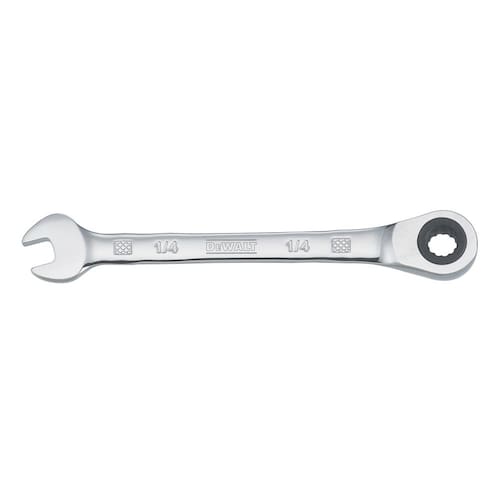 DEWALT Chave de combinação de catraca 1/4" SAE - 72 dentes oferecendo balanço de arco de 5 graus - Chave de combinação de catraca 1/10.2 cm SAE. O padrão de marca de hash estampado na alça da chave oferece um ponto de aderência adicional - A extremidade aberta de deslocamento de 15 graus permite uma maior amplitude de oscilação de arco em espaços apertados