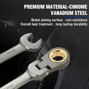 WORKPRO Chave combinada de catraca de cabeça flexível de 18 mm, construção Cr-V, revestimento de níquel, 72 dentes, design de 12 pontos, métrico - Resistente e duradoura: nossas chaves inglesas são feitas de liga Cr-V tratada termicamente de alta qualidade e niqueladas para maior durabilidade. A rotação flexível é conveniente para operação em pequenos espaços e operação sem esforço - Facilita o trabalho: a catraca de 72 dentes garante que o arco de giro de cinco graus funcione, permitindo uma operação fácil e rápida - A chave tem cerca de 23,4 cm de comprimento. A extremidade da caixa de catraca universal cabe em quatro, seis, 12 pontos, estrias, torx externo e até mesmo fixadores arredondados - Perfeito para trabalhar em espaços apertados: a cabeça da extremidade da caixa é usinada com precisão para encaixar firmemente nos fixadores. Também pode ser girado 180 graus para acessar espaços apertados - Ampla aplicação: adequado para fixar ou afrouxar porcas e parafusos em espaços estreitos. Aplicável a projetos domésticos, trabalhos de garagem, reparos de automóveis, serviços de caminhão, encanamento, construções, máquinas e muito mais