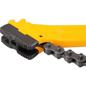 Material: Corpo em ferro fundido; Corrente em aço especial; Mordente em aço cromo vanádio Dimensões: Comprimento da chave: 340 mm; Comprimento da corrente: 460 mm