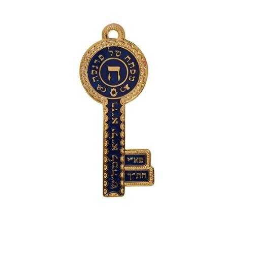 Chave de metal dourada esmaltada azul, escrito em hebraico, Mafteach Shel Parnassá prosperidade/sustento na parte superior.