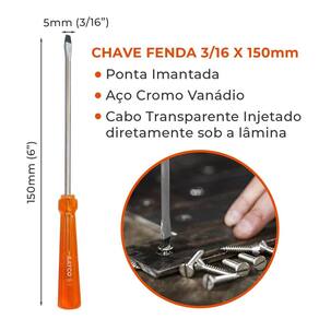Chave de Fenda 3/16 x 150mm Aço Cromo Vanádio Imantada Profissional Rayco Chave de Fenda em aço cromo vanádio com ponta magnetizada e cabo ergonômico. Ferramenta manual de altíssima qualidade, para . - Marca: Rayco - Referência: R12256 - Tamanho da ponta: 3/16 Pol. 5mm - Comprimento da Haste: 6 Pol. 150mm - Haste em aço cromo vanádio com acabamento cromado - Tipo de Ponta: Chave de Fenda Reta - - Cabo em PVC transparente injetado diretamente sob a lâmina - Ponta Magnetizada / Imantada - Cabo ergonômico - Ideal para fixar e soltar parafusos fenda - : 90 dias Marca: Não Informado
