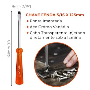 Chave de Fenda 5/16 x 125mm Aço Cromo Vanádio Imantada Profissional Rayco Chave de Fenda em aço cromo vanádio com ponta magnetizada e cabo ergonômico. Ferramenta manual de altíssima qualidade, para . - Marca: Rayco - Referência: R12262 - Tamanho da ponta: 5/16 Pol. 8mm - Comprimento da Haste: 5 Pol. 125mm - Haste em aço cromo vanádio com acabamento cromado - Tipo de Ponta: Chave de Fenda Reta - - Cabo em PVC transparente injetado diretamente sob a lâmina - Ponta Magnetizada / Imantada - Cabo ergonômico - Ideal para fixar e soltar parafusos fenda - : 90 dias Marca: Não Informado