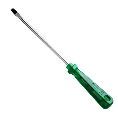 -haste em aço cromo vanádio temperada. -acabamento cromado. -ponta fosfatizada e magnetizada. -cabo em PVC verde transparente. -DIN ISO 2380. -ponta chata. -as hastes das chaves de fenda são testadas em máquina de ensaio específica, para verificar o perfeito balanço entre resistência mecânica e dureza. -os dimensionais das pontas são verificados com gabaritos-padrão calibrados e certificados, e a qualidade do fosfato é inspecionada ao microscópio. -apertar ou afrouxar parafusos de fenda simples. -as ferramentas são produzidas e testadas conforme normas específicas.