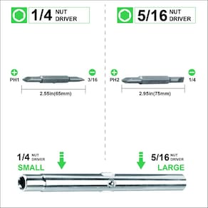 - Inclui drivers de porca de 1/4 de polegada e 5/16 polegadas, #1 e #2 Phillips e ranhuras de 1/4 de polegada e 3/16 polegadas