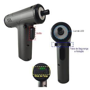 Na parte traseira possui indicativo de força, são 4 níveis, ajustável de acordo com a sua necessidade. Também é indicativo durante o carregamento, a luz ficará piscando e ficará estática quando a carga estiver completa. E durante o carregamento a Chave de Fenda não funciona.