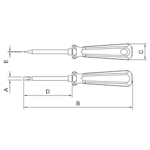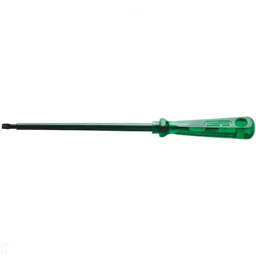 Seja em manutenções industriais ou automotivas, apertar ou afrouxar parafusos se torna mais fácil com a ajuda das Chaves Easygrip da Tramontina PRO. Seu cabo com formato sextavado proporciona maior conforto e agilidade na utilização. Estão disponíveis com ponta chata, cruzada, trafix, trafix PZ e canhão nos modelos tradicional, toco e com isolação. Escolha o tamanho ideal para o seu trabalho e mãos à obra. Orientações Haste em aço cromo vanádio temperada. Ponta fosfatizada.Cabo em PVC verde transparente.Isolação de 1000 V c. a.Produto em conformidade com a NBR9699 e NR10. DIN ISO 2380.As hastes das chaves de fenda são testadas em máquina de ensaio específica, para verificar o perfeito balanço entre resistência mecânica e dureza.Os dimensionais das pontas são verificados com gabaritos-padrão calibrados e certificados, e a qualidade do fosfato é inspecionada ao microscópio.As chaves de fenda isoladas são amplamente testadas, o que promove segurança na sua utilização em locais com tensões de até 1000 V c. a.Indicada para trabalhos em redes de tensão até 1.000 volts c. a.As ferramentas são produzidas e testadas conforme normas específicas. Características Gerais EAN13 7891114088939 DUN14 17891114088936 NCM 8205.40.00 Peso Líquido 0,0920 kg. Peso Bruto 0,0960 kg. Metragem 0,000161 m³. Dimensões Embalagem (Compr. X Larg. X Alt.) 215x 30x 25 mm. Dimensões Produto (Compr. X Larg. X Alt.) 209x 29x 29 mm. Cor 1 3C775F Hexa Dimensão Extra A 6,0 mm. Dimensão Extra B 209,0 mm. Dimensão Extra C 28,7 mm. Dimensão Extra D 100,0 mm. Dimensão Extra E 1,2 mm. Observações Sempre utilizar óculos de segurança para proteger os olhos.Utilizar luvas para proteger as mãos.Sempre utilizar chaves de fenda isoladas, identificadas pela marcação 1000 V, quando é necessário trabalhar em um local que tenha corrente elétrica.Utilizar chaves com ponta adequada para cada tipo de fenda, para conseguir realizar a tarefa mais rápido e de forma segura.Respeitar o torque estabelecido por norma para cada bitola.Não usar as chaves de fenda como formão ou alavanca.Não alterar as dimensões originais da ponta para obter outro perfil.
