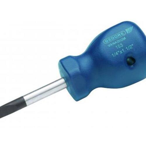 Haste em aço gedore-vanadium e cabo em polímero na cor azul padrão gedore. Haste com acabamento niquelado e cromado, com ponta escurecida. Cabo ergonômico. Chave com haste redonda e resistente, com formato curto. Largura da ponta é igual ao diâmetro da haste, possibilitando o uso em bornes (terminais) na linha elétrica e eletrônica. Perfil de encaixe para parafuso tipo fenda simples.