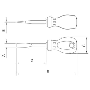 Seja em manutenções industriais ou automotivas, apertar ou afrouxar parafusos se torna mais fácil com a ajuda das Chave Ultragrip Plus da Tramontina PRO. Seu cabo emborrachado proporciona maior conforto e firmeza na utilização. Estão disponíveis com ponta chata e cruzada, nos modelos tradicional e toco. Quem é PRO usa. Orientações Haste em aço cromo vanádio temperada. Acabamento cromado.Ponta fosfatizada e magnetizada.Cabo com dupla injeção em PP e borracha.DIN ISO 2380.Ponta chata.As hastes das chaves de fenda são testadas em máquina de ensaio específica, para verificar o perfeito balanço entre resistência mecânica e dureza.Os dimensionais das pontas são verificados com gabaritos-padrão calibrados e certificados, e a qualidade do fosfato é inspecionada ao microscópio.Apertar ou afrouxar parafusos de fenda simples.As ferramentas são produzidas e testadas conforme normas específicas. Características Gerais EAN13 7891114152142 DUN14 17891114152149 NCM 8205.40.00 Peso Líquido 0,0450 kg. Peso Bruto 0,0450 kg. Metragem 0,000095 m³. Dimensões Embalagem (Compr. X Larg. X Alt.) 105x 30x 30 mm. Dimensões Produto (Compr. X Larg. X Alt.) 104x 32x 32 mm. Dimensão Extra A 8,0 mm. Dimensão Extra B 104,0 mm. Dimensão Extra C 32,0 mm. Dimensão Extra D 38,0 mm. Dimensão Extra E 1,2 mm. Observações Use óculos, luvas e outros equipamentos de proteção individual (EPIs) de acordo com a tarefa a ser executada. Utilize chaves de fenda isoladas, identificadas pela marcação 1.000 V, quando for necessário trabalhar em locais com corrente elétrica. Importante: nestes casos, inspecione a integridade da isolação elétrica, e, se aparecerem trincas na isolação, suspenda o uso imediatamente. Utilize chaves com ponta adequada para cada tipo de fenda, para realizar a tarefa de forma mais rápida e segura. Respeite o torque estabelecido por norma para cada bitola. Não utilize as chaves de fenda como formão ou alavanca. Não altere as dimensões originais da ponta para obter outro perfil. Armazene em local limpo e seco.