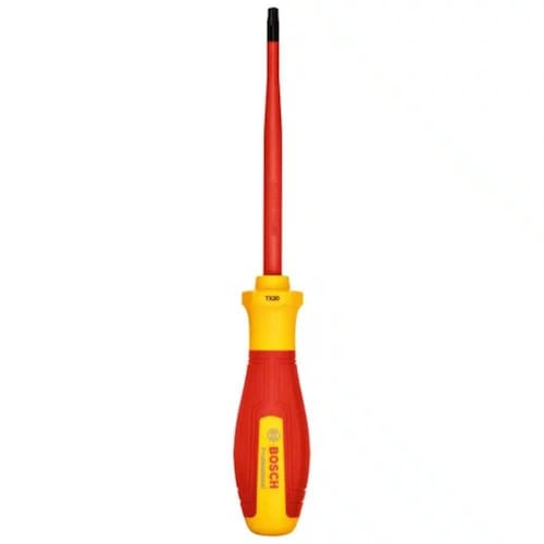 A Chave VDE Torx TX 30 x 125 milímetros 1600A02NC9 Bosch é indicada para apertar e desapertar parafusos Torx em aplicações profissionais, garantindo segurança mesmo em contato acidental com partes sob tensão. Certificada conforme a norma DIN EN/IEC 60900, é testada até 10.000 volts e isolada para uso seguro em até 1.000 volts.
