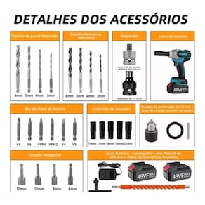 Ficha técnica: - Rpm: 0-3300 - Impacto: 0-3000 - Max Toque: 360n.M / 36Kgfm - Peso: 1Kg - Tipo bateria: Lítio 48V - Votagem: 110-220 Bivolt - Motor: Sem escovas Marca: Não Informado