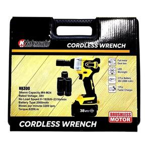 Chave De Impacto Bateria 38v Brushless Profissional Nakasaki Parafusadeira 1/2 Bateria Lítio 38V Profissional NK300 BRUSHLESS Chave de Impacto a Bateria de Lítio 38V com impacto NK300. Novidade no Brasil, potente, moderna a resistente chave de impacto a bateria. Carregador bivolt. Encaixe 1/2 Polegada. Motor Sem Escova: Tecnologia Brushless Maior durabilidade Livre de trocas de escovas - Marca: NAKASAKI - Modelo: NK300 - Tensão: Bivolt - Bateria Litio: 38V - Torque: 380Nm - Velocidade sem carga: 0 a 2.060 rpm - Encaixe: 1/2 Polegada - Mais fácil de desparafusar - Alta Qualidade - Luz de indicação para trabalhos em ambientes escuros - regulador continuo - Modo de comutação mais conveniente para melhorar a eficiência do trabalho - Cabo emborrachado: material é feito de anti derrapante, que é fácil de ver, não solta fácil - Dimensões Embalagem: 33X29X11CM - Peso Bruto: 3,6Kg - : 90 dias Itens inclusos: - 1 Chave de Impacto a Bateria 38V -- 3 Soquete de impacto 17/19/22MM - 1 Carregador Bivolt - 2 Bateria de lithium 4 Ah - 1 Soquete de impacto Marca: Sa, Songle, Nakazaki Ou Siga It-Blue