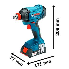 A chave de Impacto a bateria Bosch GDX 180-LI, 18V, possui exclusivo sistema Bosch com mandril 2 em 1: 1/4" hexagonal e 1/2" quadrado. Vem com sistema de proteção da bateria que protege as células evitando superaquecimento, garantindo maior durabilidade da sua ferramenta. Além disso, com a chave de impacto a bateria Bosch GDX 180-LI você tem mais produtividade com maior rotação, torque e impactos por minuto. Ideal para telhadistas, montadores de estruturas metálicas, construtoras, carpinteiros, indústrias, oficinas automotivas, dentre outros. Ferramenta 100% compatível com baterias e carregadores 18V Bosch. Produto vem com duas baterias e maleta. Garantia 1 ano Bosch.