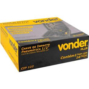 1 Chave de impacto. Acompanha: 1 maleta plástica, 10 soquetes com encaixe de 1/2 (9 mm, 10 mm, 11 mm, 13 mm, 14 mm, 17 mm, 19 mm, 22 mm, 24 mm e 27 mm), 1 extensão 5 com encaixe de 1/2, 1 minilubrificador, 1 conector de engate rápido e 1 chave allen.