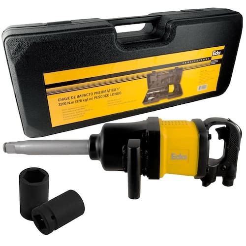 Chave de Impacto Pneumática 1 Pol. Longa 3.200 Nm Eda Profissional Chave de impacto é indicada para fixar e soltar parafusos e porcas, como também para montagem e manutenção, instalação de moldes para injeção, montagem e desmontagem de rodas de caminhões e máquinas, mecânica, etc. Utilizada em indústrias, oficinas, centros automotivos, metalúrgicas, entre outros. - Marca: Eda Profissional - Código: 0SP - Chave de Impacto com encaixe de 1 Polegada - Uso industrial e profissional - Velocidade livre: 3.200rpm - Torque máximo: 3.200 N.M 326 kgf.M - Pressão de trabalho 90 PSI - Consumo de ar: 13,4 CFM - Entrada de ar: 1/2 - Pescoço longo: 230mm - Inclui maleta e 2 soquetes 32 e 33 mm - Ideal para trabalho em borracharias, oficinas, caminhões, ônibus, tratores, etc - Gatilho para segurança do operador em ação suave que permite um menor controle de velocidade - Peso: 16.4kg - Dimensões da maleta: 65 x 28 x 17cm - : 90 dias Itens inclusos: - 1 Chave de Impacto Pneumática 1 Pol. 3.200nm - 1 Soquete de Impacto 32mm - 1 Soquete de Impacto 33mm - 1 Engate para mangueira de 1/2 Pol. - 1 Recipiente para óleo lubrificante - 1 Maleta Marca: Não Informado