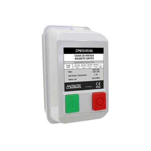 Chave de partida direta trifásica para manobras e proteção de motores em caixas termoplásticas. Robusta caixa com base metálica. Grau de proteção IP56.Aplicações: Sistemas de Irrigação e Bombeamento, Indústrias, Edifícios, Ventiladores e Exaustores, Máquinas e Equipamentos, Piscinas.Características Técnicas:Potência: 1CVAlimentação: 220VCAFaixa de Ajuste: 2,8 - 4APotência Máxima: 5,5KwComposição: Contator + Relé de sobrecargaREF: CPM12-H5-4ASKU: 1503