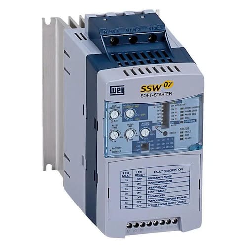 Chave de partida soft starter weg ssw07 17a 220v 380v 440v 525v 575v softstarters são chaves de partida estática, projetadas para a aceleração, desaceleração e proteção de motores elétricos de indução trifásicos, através do controle da tensão aplicada ao motor. as softstarters weg ssw07 e ssw08 foram desenvolvidas com controle dsp digital signal processor , projetadas para garantir a melhor performance na partida e parada de motores de indução, sendo uma solução completa com excelente custobenefício. a interfacehomemmáquina ihm incorporada permite ajustes e configuração de forma fácil e rápida. também é possível adicionar ihm remota, interface de comunicação ou entrada para ptc de motor. desenvolvidas para uso industrial ou profissional, as softstarters ssw07 e ssw08 são compactas e possuem bypass incorporado, contribuindo assim para o aumento da vida útil do acionamento, otimização de espaço e menor dissipação de calor em painéis elétricos. as softstarters ssw07 e ssw08 são equipadas com as mesmas funcionalidades, sendo que a ssw07 é recomendada para acionamento de cargas pesadas, enquanto a ssw08 para cargas leve a moderadas.