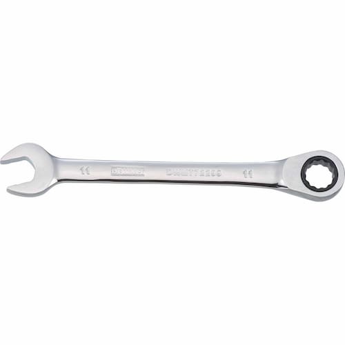 DEWALT DWMT72299OSP Chave de pente de catraca 11 mm - 72 dentes oferecendo balanço de arco de 5 graus - Chave de combinação de catraca de 11 mm. O padrão de marca de hash estampado na alça da chave oferece um ponto de aderência adicional - A extremidade aberta de deslocamento de 15 graus permite uma maior amplitude de oscilação de arco em espaços apertados