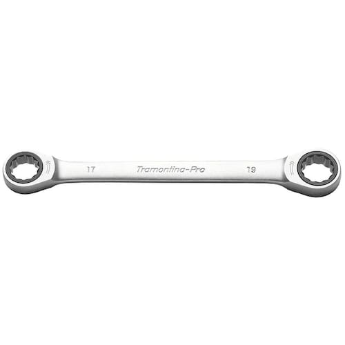 As chaves estrela com catraca da Tramontina PRO permitem realizar trabalhos com mais agilidade do que com uma chave estrela comum. Além disso, sua construção robusta permite dar apertos finais. Com as chaves da Tramontina PRO, quem passa aperto é o parafuso. Orientações Acabamento cromado.Catraca fosfatizada.72 dentes.As chaves de aperto são produzidas em aço ligado com cromo vanádio (Cr-V), e apos submetidas a testes rigorosos de torque para atender a norma DIN 1711-1.O teste de dureza é realizado em vários pontos para assegurar a resistência ao desgaste da chave durante o uso ininterrupto.Devido à incorporação de um mecanismo com catraca, esta ferramenta permite realizar trabalhos com mais agilidade e facilidade do que uma chave estrela comum.As ferramentassão produzidas e testadas conforme normas específicas. Observações Use óculos, luvas e outros equipamentos de proteção individual (EPIs) de acordo com a tarefa a ser executada. Não golpeie as chaves, a não ser que sejam projetadas para este fim. Sempre utilize uma chave de bitola correta para cada parafuso ou porca para que não haja folga, pois isso danifica a chave e o parafuso. Mantenha a chave limpa para um melhor agarre, pois usá-la suja com graxa ou óleo pode causar acidentes. Não use tubos ou extensões para obter mais torque. Não altere a forma original das chaves. Respeite o torque estabelecido por norma para cada tamanho de chaves. Use a chave perpendicular ao eixo do parafuso e/ou porca. Isto aumenta a vida útil da ferramenta e torna a operação mais segura. Armazene em local limpo e seco. Características Gerais EAN13 7891114061222 DUN14 17891114061229 NCM 8204.11.00 Peso Líquido 0,1300 kg. Peso Bruto 0,1300 kg. Metragem 0,000182 m³. Dimensões Embalagem (Compr. X Larg. X Alt.) 220x 55x 15 mm. Dimensões Produto (Compr. X Larg. X Alt.) 170x 25x 8 mm. Dimensão Extra A 23,0 mm. Dimensão Extra B 170,0 mm. Dimensão Extra C 8,2 mm. Dimensão Extra D 24,8 mm.