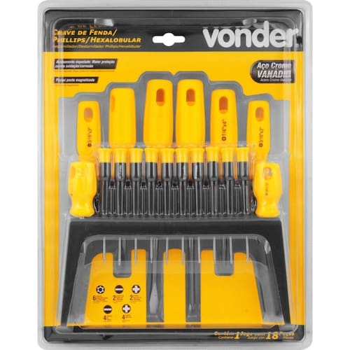 Ref. Fornecedor:3072218000marca:vonderconteúdo da embalagem:1 Jogo de chaves de fenda/phillips/hexalobular, composto por suporte plástico com 18 peças, sendo: 6 chaves hexalobular de precisão T5 x 50 mm T6 x 50 mm T7 x 50 mm T8 x 50 mm T9 x 50 mm e T10 x 50 mm , 2 chaves fenda de precisão 2,5 mm x 50 mm e 3,0 mm x 50 mm , 2 chaves phillips de precisão PH00 x 50 mm e PH0 x 50 mm , 4 chaves fenda 6 mm x 38 mm 1/4 x 1.1/2 5 mm x 75 mm 3/16 x 3 , 6 mm x 100 mm 1/4 x 4 , 8 mm x 150 mm 5/16 x 6 e 4 chaves phillips: PH2 x 38 mm 1/4 x 1/1/2 PH1 x 75 mm 3/16 x 3 , PH2 x 100 mm 1/4 x 4 PH3 x 150 mm 5/16 x 6 . Destaques e diferenciais:Produzido em aço cromo vanádio, proporcionando maior resistência e durabilidade. Possui acabamento niquelado que aumenta a proteção contra oxidação/corrosão. Conta com ponta magnetizada que facilita tanto a colocação quanto a retirada de parafusos em locais de difícil acesso, cabo anatômico em polipropileno que garante maior conforto ao operador e suporte plástico para melhor organização das peças.Aplicações e dicas de uso:Indicado para fixar e soltar parafusos fenda, phillips e hexalobulares.Características Técnicas:Material do jogo de chave fenda e phillips: Aço cromo vanádio Acabamento do jogo de chave de fenda e phillips: Niquelado Material do cabo da chave: Polipropileno Ean: 7893946619879