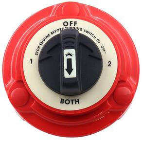 Chave seletora para 2 baterias, em plástico de grande resistência, na cor vermelho, com aro fluorescente para fácil operação sob baixa luminosidade, terminais em bronze anti-oxidantes, com cara de trabalho de 300A contínuo e 400A intermitentes, até 32V.