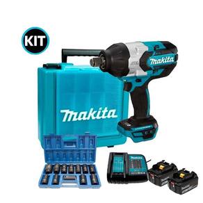 Chave de Impacto 3/4 Bateria 18V LXT Makita DTW1001Z + Kit 2 Baterias 5Ah e Carregador Bivolt + Jogo de Soquete 12 peças