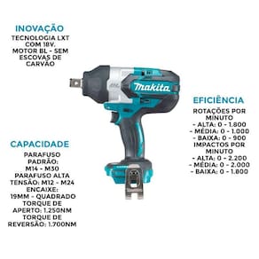 Dados técnicos: Capacidade de aperto - parafuso padrão: m14 - m30 - parafuso alta tensão: m12 - m24 - encaixe: 19mm - quadrado Rotações por minuto - alta: 0 - 1.800 - média: 0 - 1.000 - baixa: 0 - 900 Impactos por minuto - alta: 0 - 2.200 - média: 0 - 2.000 - baixa: 0 - 1.800 Torque de aperto: 1.250 n.M Torque de reversão: 1.700 nm Dimensões c x l x a : 229 x 91 x 227 mm Peso: 3,06 kg peso sem bateria Bateria: 18v Marca: Não Informado