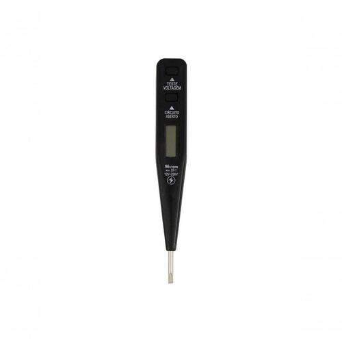 Descricao - Caracteristicas: Facil de usar; Aperte o botao e confira a medicao no visor; Com clipe; Nao precisa de bateria; Voltagem: 12V - 250V. - Instrucoes de uso: Teste para medicao de 12V a 250V para corrente alternada e corrente continua, mede terra e fase; O condutor nao precisa estar descascado, basta apertar o botao. - Medicao direta: Encoste a ponta da chave teste no fio ou ponto de circuito que deseja medir e aperte o botao de medicao. O simbolo e o valor da tensao serao mostrados no display; Os digitos finais que aparecem, indica o valor aproximado de tensao medido; Se o valor medido estiver 70% abaixo do valor esperado, a chave teste ira mostrar o valor aproximado em sua escala interior. - Identificar tomada 220V: Coloque a ponta da chave teste nos dois orificios da tomada. O display devera indicar 110V para cada orificios. - Para medicao de tensao DC. Mantenha um dedo em contato com um dos polos de bateria e a ponta da chave teste em outro polo (0 display indicara valores a partir de 12V); O simbolo e o valor aproximado aparecerao no display. - Circuito aberto: O teste identifica se o condutor esta energizado; Basta aproximar a ponta da chave teste no fio eletrico encapado e ao pressionar o botao circuito aberto, no display LCD aparecera o simbolo, se ele estiver energizado. - Antes do uso: Verificar se o produto esta em perfeita condicoes de uso. - Cuidados: Nao utilize a ferramenta em locais umidos. Risco de choque eletrico. Para reduzir o risco de lesoes, sempre use adequadamente equipamentos de protecao individual (oculos de protecao, botas, mascara, luvas etc.) necessario ao trabalho; Atencao: Nao utilize para apertar parafusos; Em caso de duvidas, consulte um eletricista. A rede eletrica pode ser perigosa; Guarde em local seguro. - Advertencia/Antecao: Guarde estas instrucoes para futuras consultas; Manter fora do alcance das criancas. *Imagens meramente ilustrativas. Especificacao Tecnica -