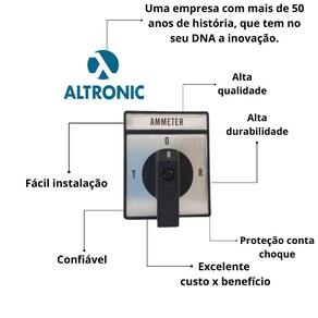 Características técnicas: Marca: altronic; Modelo: cra-20; Tipo de interruptor: chave rotativa; Tensão nominal: 220-240v/ 380-440v; Corrente: 20a; Posições: 4 posições; Tensão nominal de isolamento: 660v.