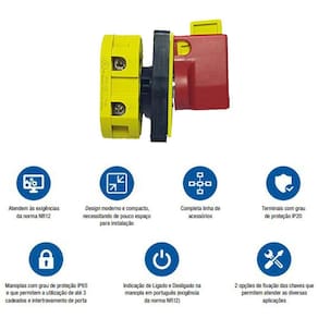 As chaves seccionadoras compactas são a solução ideal para o seccionamento de circuitos sob carga. Estão disponíveis nas correntes de 12A a 160A com tipo de fixação em base ou topo. Estas chaves atendem a norma NR12.Corrente nominal fusível: 12.0 ATipo montagem: Para montagem em painelNúmero de polos: 2 polosAcessórios: Com manoplaPrincipais características-desenvolvidas de acordo com a norma IEC60947-3-atendem as exigências da norma NR12-design moderno e compacto, para facilitar a instalação-completa linha de acessórios-proteção dos terminais classe IP20-proteção frontal classe IP65 para manoplas